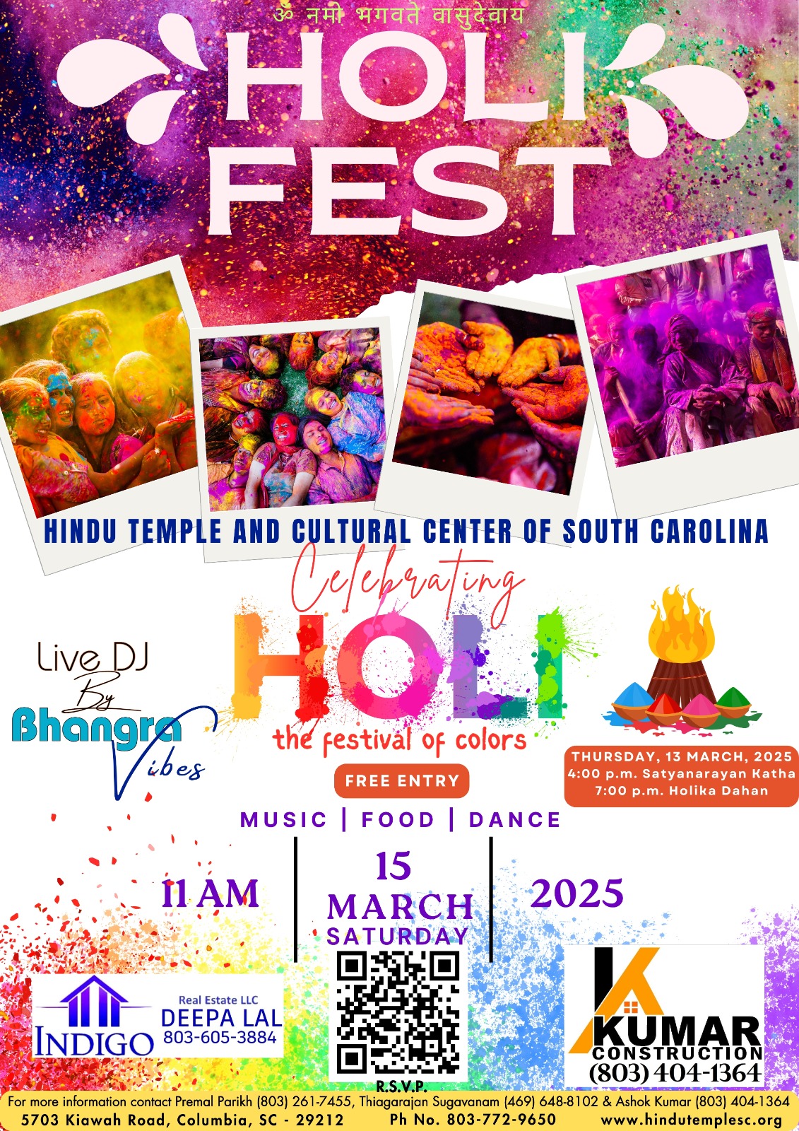 Hindu Temple and Cultural Center of South Carolina invites you and your family for the Holi celebrations on March 15, 2025 Saturday.
