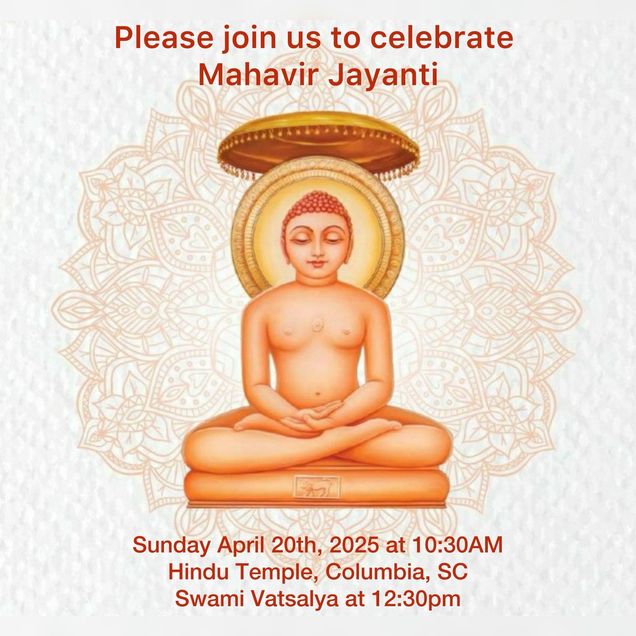 Hindu Temple and Cultural Center of South Carolina invites you and your family for the Mahavir Jayanti celebrations on April 20, 2025 Sunday.